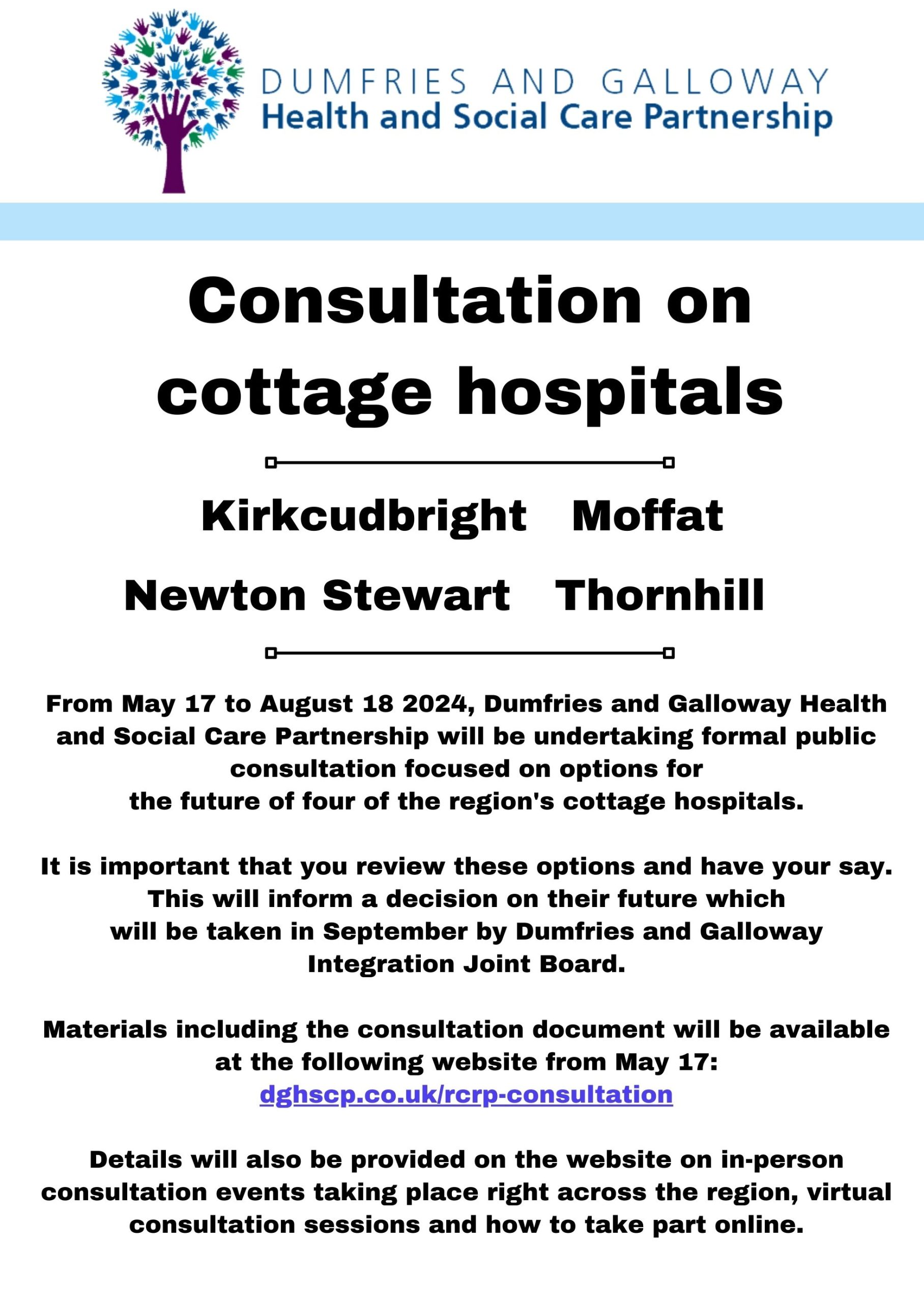 DROP-IN consultation events on the role of four of the region’s cottage hospitals begin next week. Consultation is taking place on options for cottage hospitals in Moffat, Thornhill, Kirkcudbright and Newton Stewart, with drop-in events for the public taking… Cottage hospital consultation drop-in sessions start next week